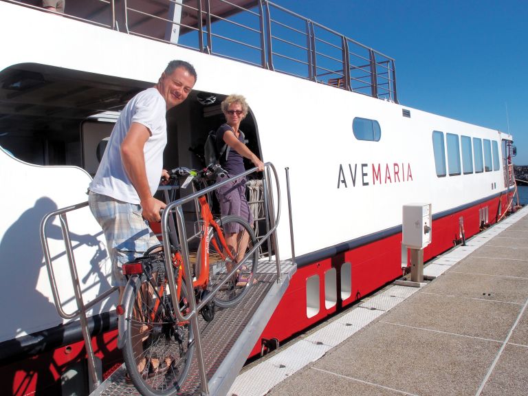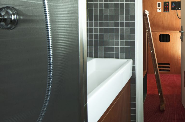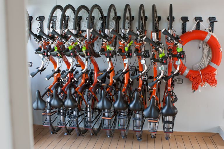 Bikes are stowed away on a compact, vertical rack with a secure locking mechanism and are available to passengers at all times. E-bikes can be recharged here.