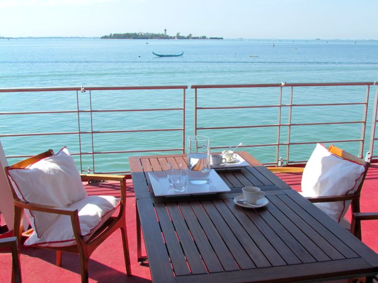 The sundeck with tables and chairs is the perfect spot to enjoy sailing, outdoor dining and chat with your new travel companions.