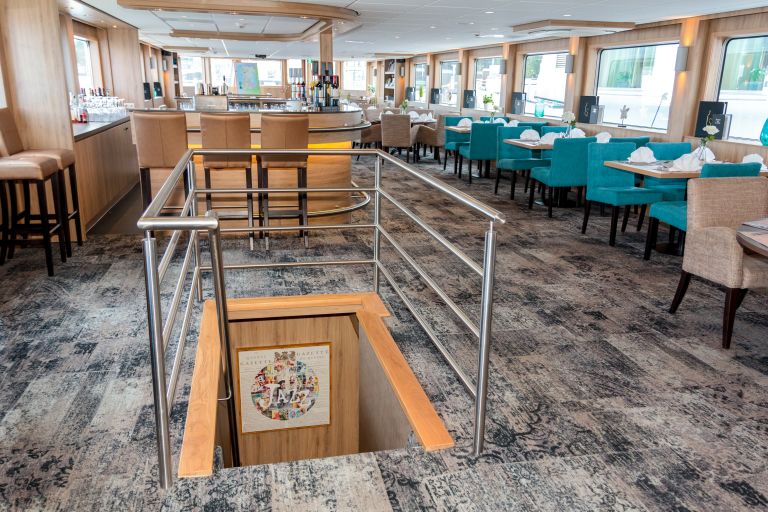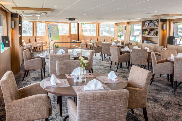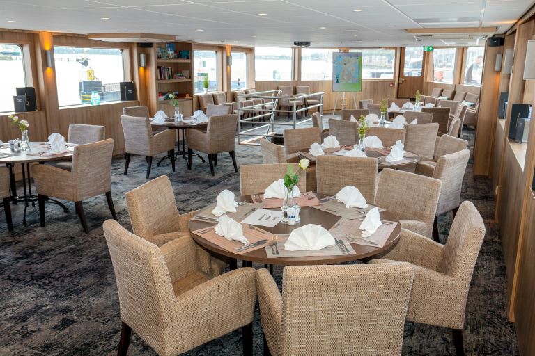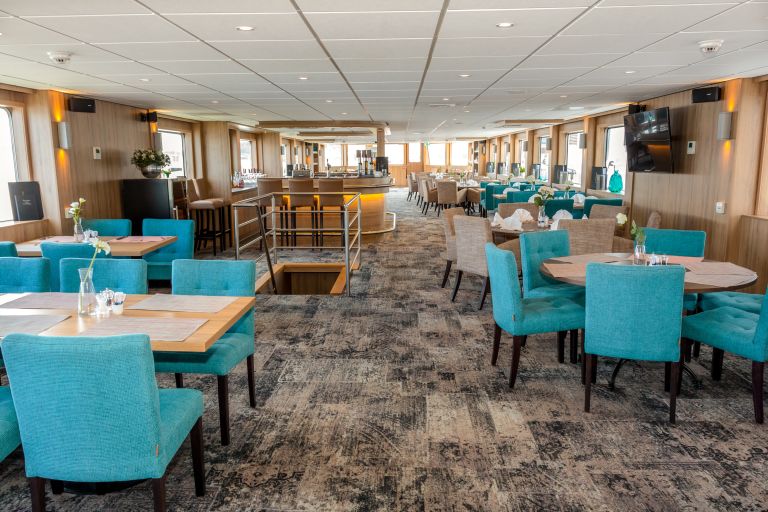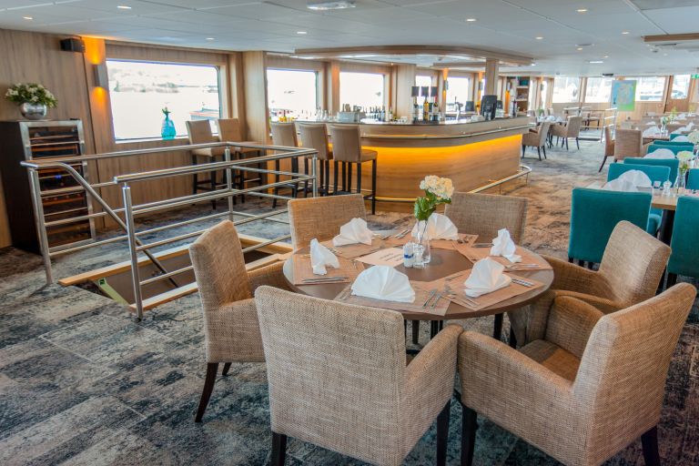 Restaurant, bar and lounge area are located on the upper deck and feature large panoramic windows.