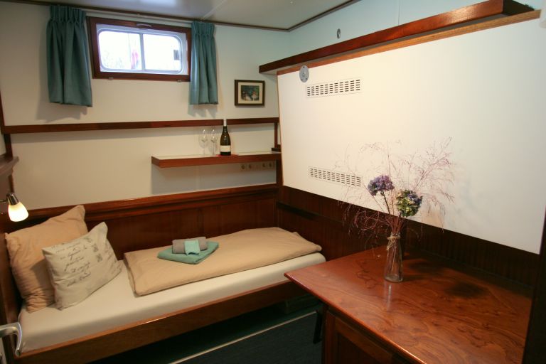 - 2 twin cabins with two split level beds of about 8 sq. meters. These twins can also be used as singles by folding up the split level bed