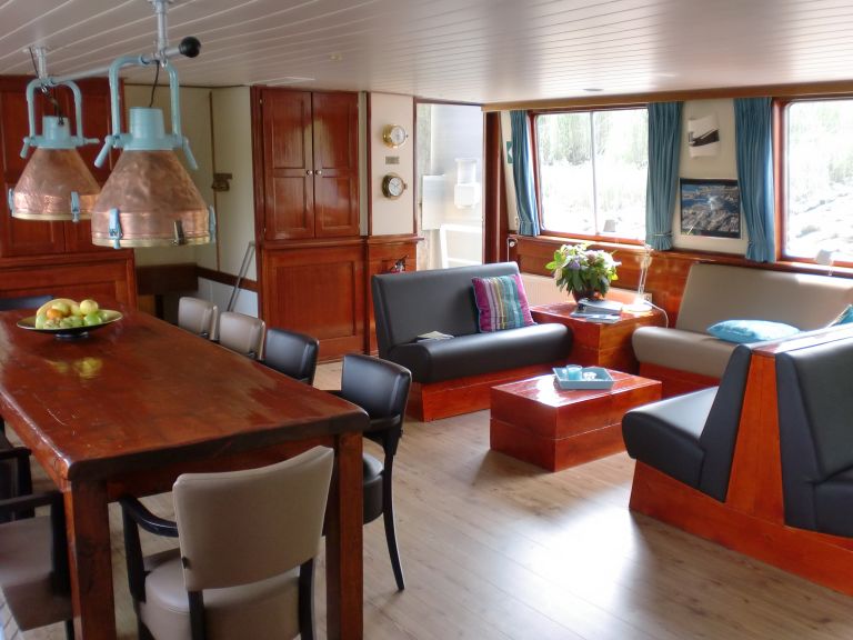 Breakfasts and dinners are served in the cozy dining room, located on the lower deck.