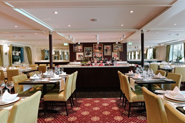 Breakfast and dinner are served in the spacious restaurant located on the lower deck. Large windows allow plenty of natural light into the restaurant. The upper deck has a lounge area and bar with tall windows that allow guests to enjoy the splendid view throughout the entire cruise.