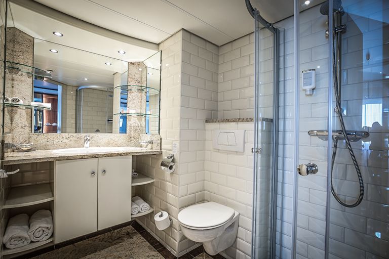 All cabins measure 14 sq. meters and are equipped with a double bed which can be divided into two single beds.