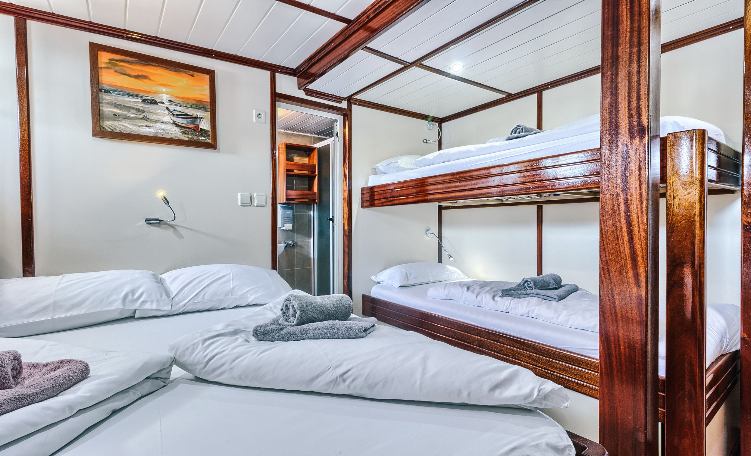 - 2 quadruple cabins on the lower deck with double bed, single bed and bunk bed