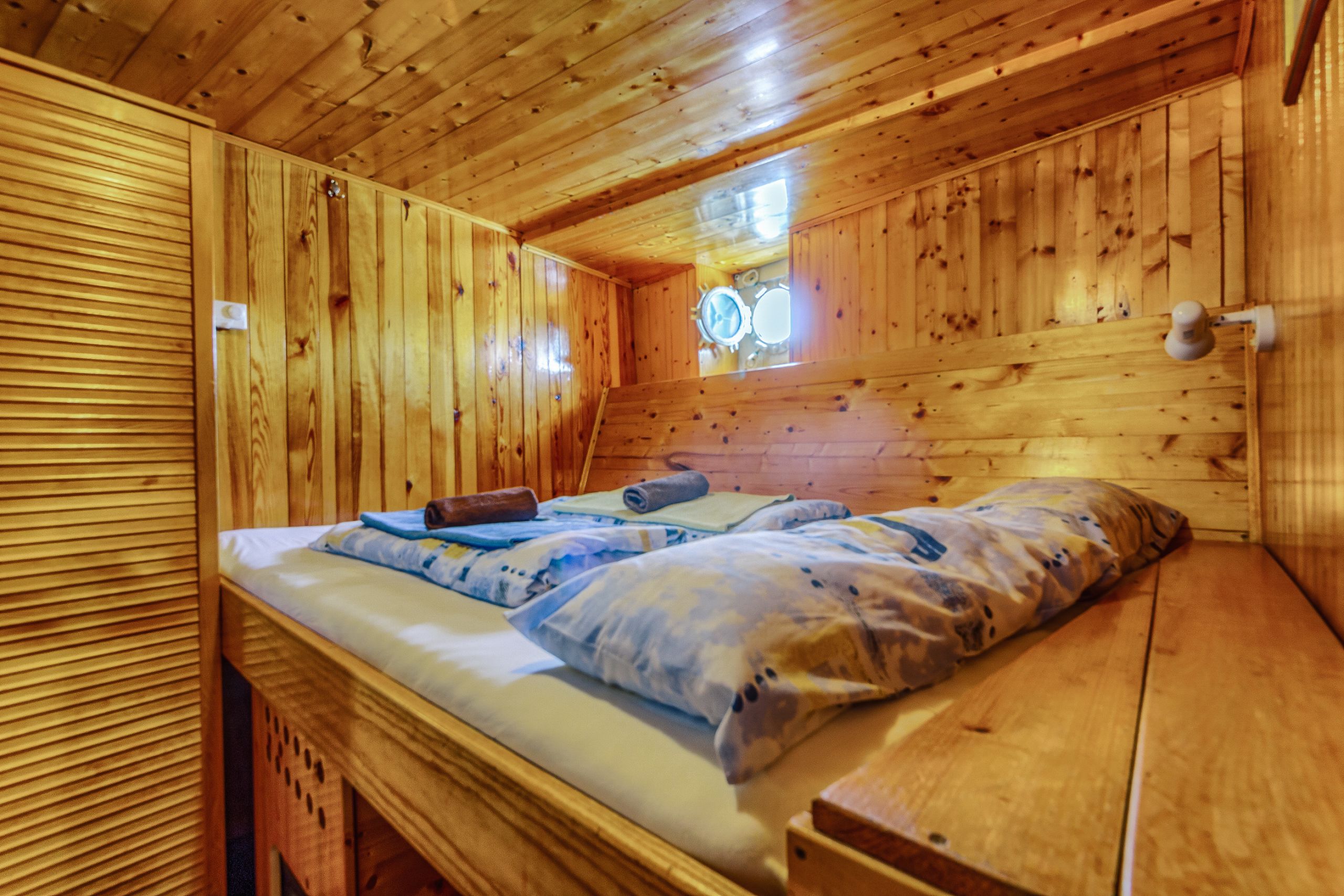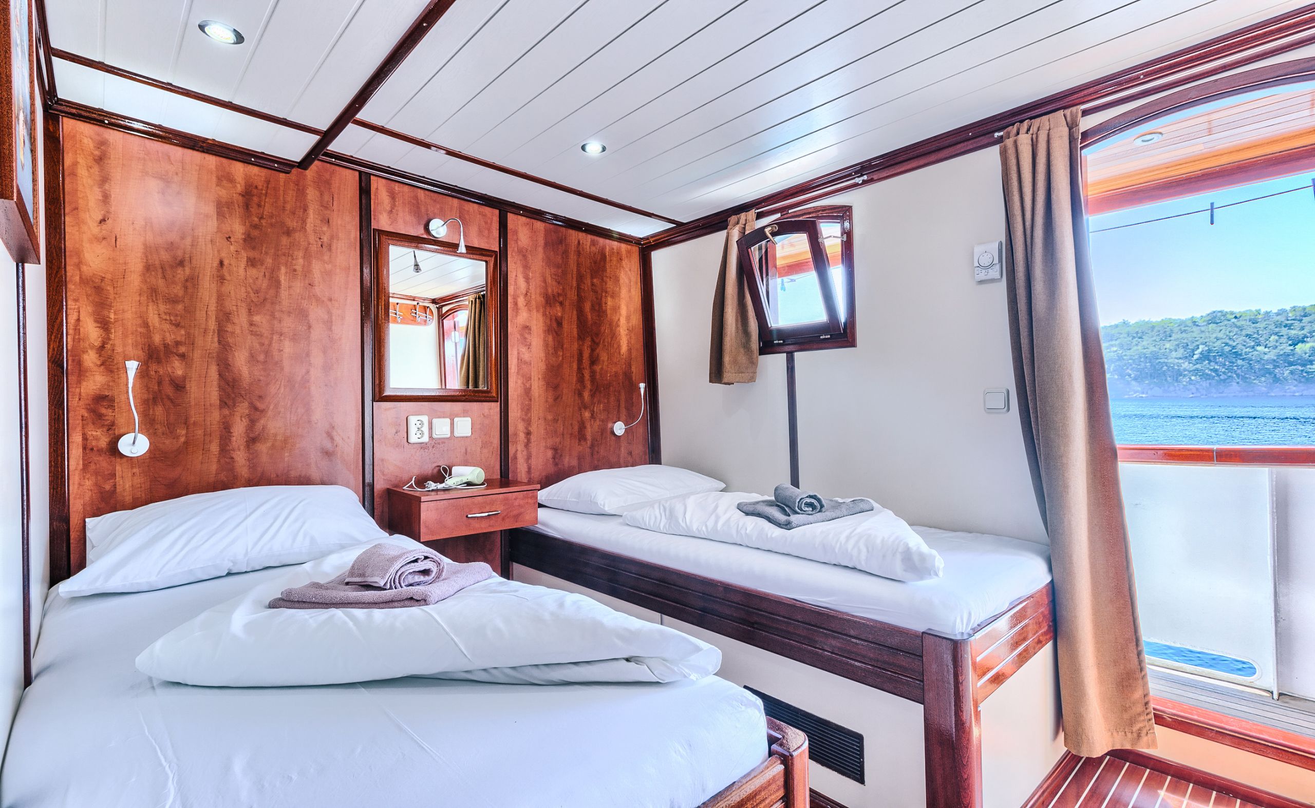 - 5 double cabins on the lower deck with double beds. Two cabins also have a third single bed