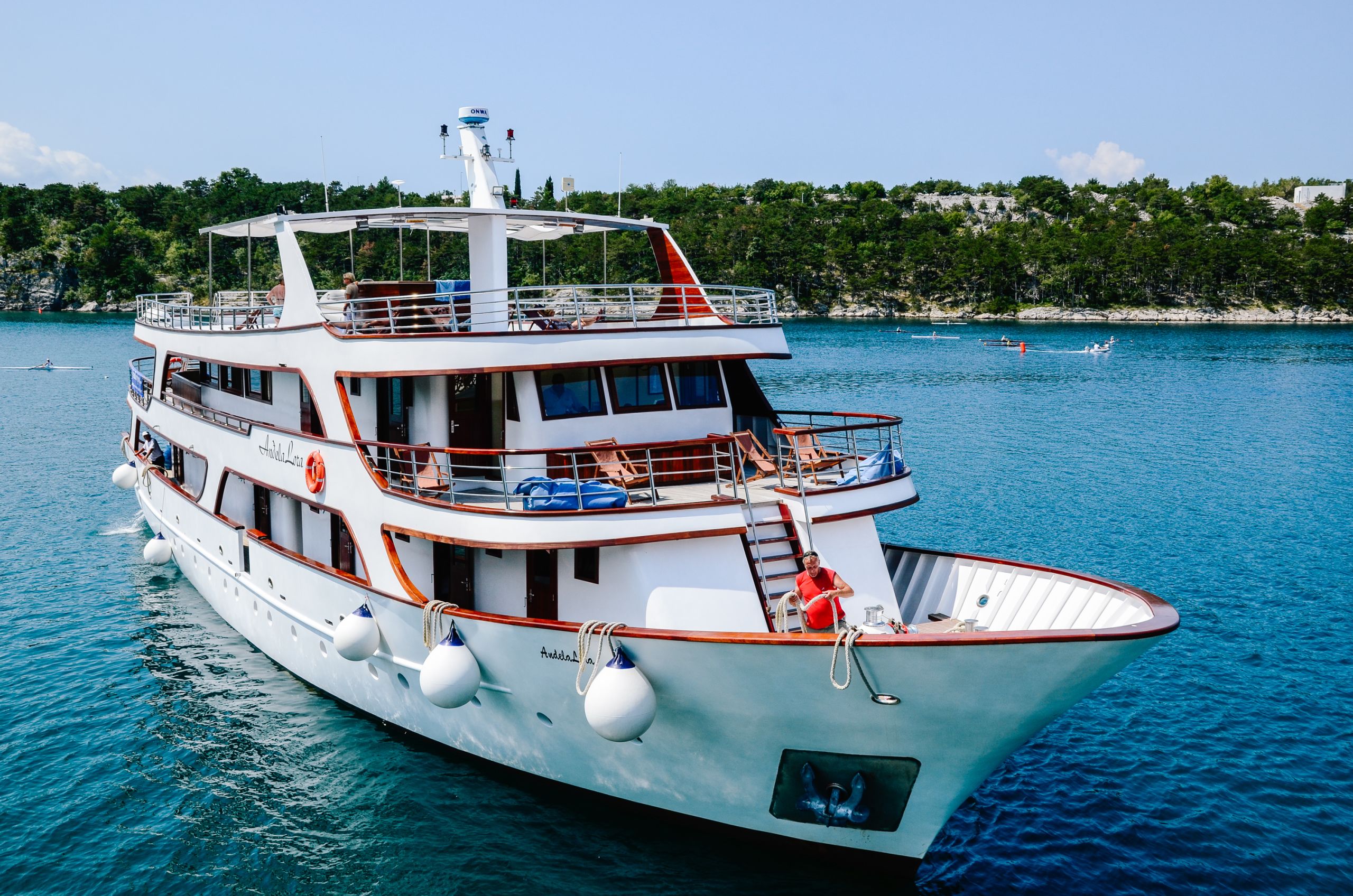 Individual arrival in Omišalj, a nice little harbor village on the island of Krk. Check-in on the motor yacht between 2 and 2:30 pm. At approx. 3 pm the ship takes us to Opatija. After dinner, take part in a guided tour of the town. Overnight stay in Opatija.