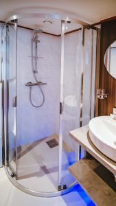 All cabins have private bathrooms with shower, air conditioning, mini safe, TV, closet and hair dryer.