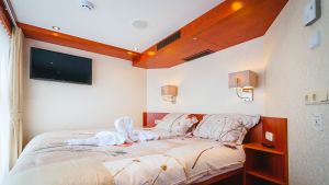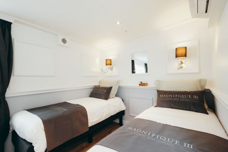 - 14 twin cabins on the lower deck (below deck), 11 m², with two single beds and windows that cannot be opened