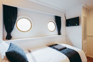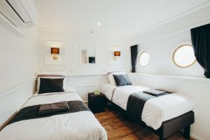 All cabins have two single beds (can be joined to form a double on request), private bathroom, air conditioning, mini safe, TV, closet and hair dryer.