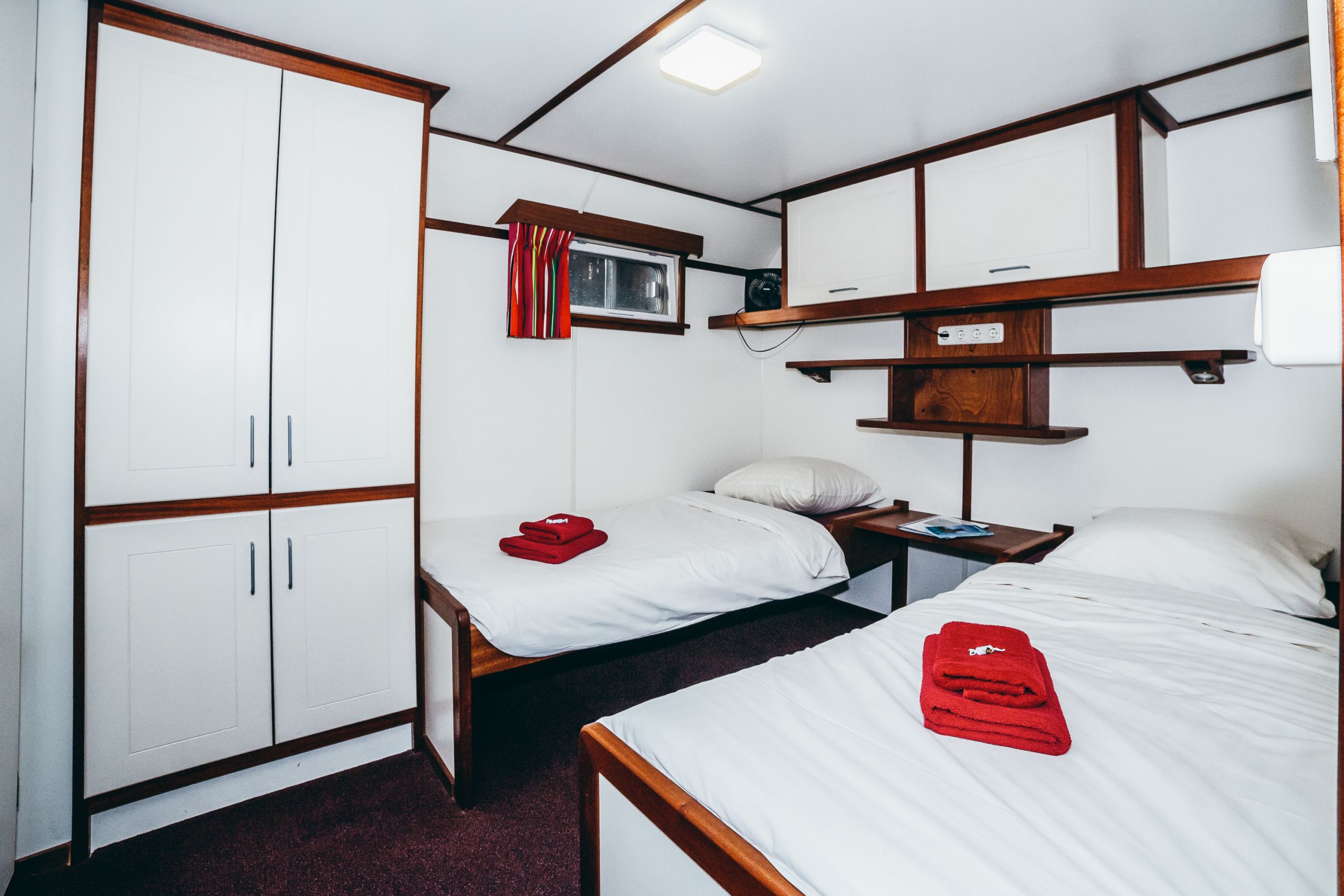All cabins have 2 low beds, private bathroom, opening windows, hair dryer.