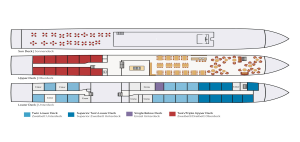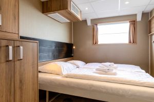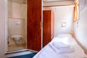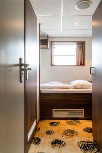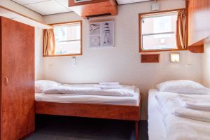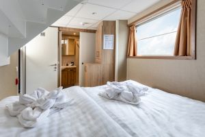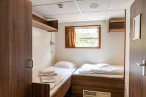 - 12 double cabins on the upper deck with a double bed or two single low beds. One upper deck cabin has the possibility for a third bunk bed (above one of the beds)